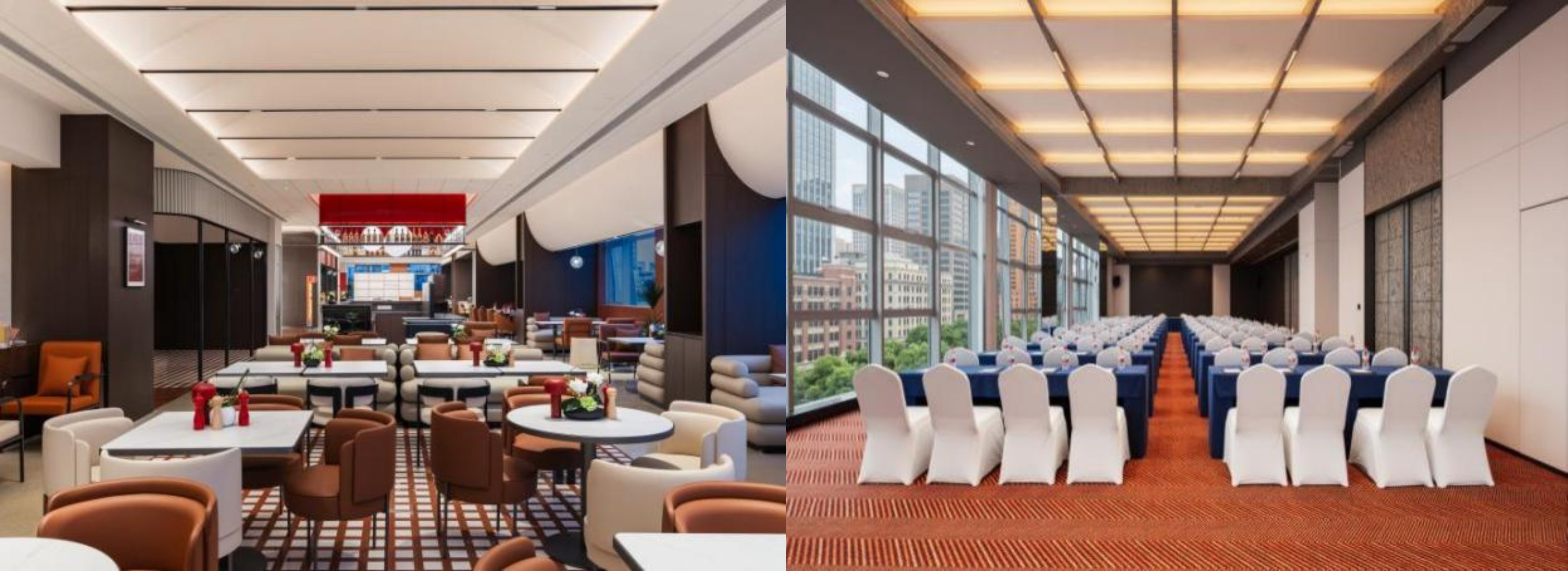 该项目整体楼高21层,丽芮及锦江都城大堂均位于一楼,客房各分布8个楼层,5楼与6楼的多功能厅及餐厅为双品牌共享空间。多功能厅总面积达600㎡,采用模块化设计,可根据活动规模与类型灵活分隔为10-300人不等的独立区域;餐厅深度融合成都本土美食,构建涵盖早餐、正餐、下午茶、酒吧的全时段餐饮服务体系。可提供“会议+餐饮”一体化服务,无论是小型闭门会议、中型品牌发布,还是大型社交派对,都能精准适配。