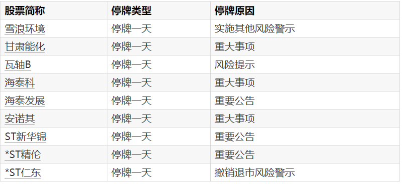 A股停牌提示:9股今日停牌