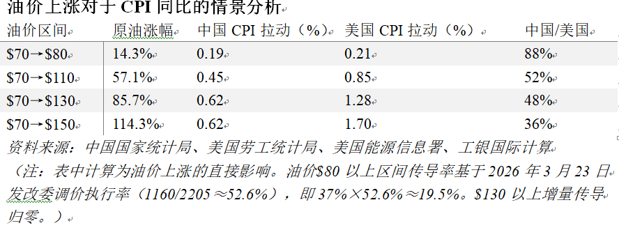 在一阶直接效应口径下,如果布伦特原油价格由70美元/桶升至110美元/桶时,则对中国CPI的拉动为0.45个百分点左右,约为美国近似口径影响(0.85个百分点)的52%。不仅如此,考虑到石油仅占中国一次能源消费18%的结构特征,意味着间接传导强度相对更低,从而使总效应大概率弱于更加依赖石油的经济体。