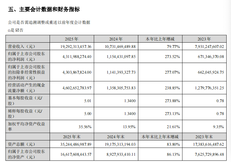 年报显示,2025年度胜宏科技实现营业收入192.92亿元,同比增长79.77%;实现归属于上市公司股东的净利润43.12亿元,同比增长273.52%。