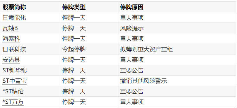 A股停牌提示:9股今日停牌