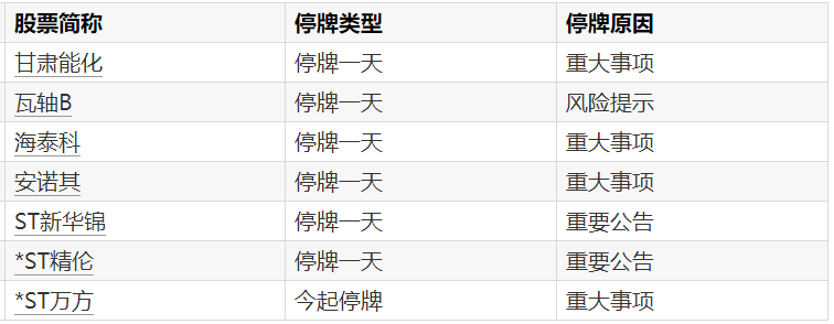 A股停牌提示:7股今日停牌