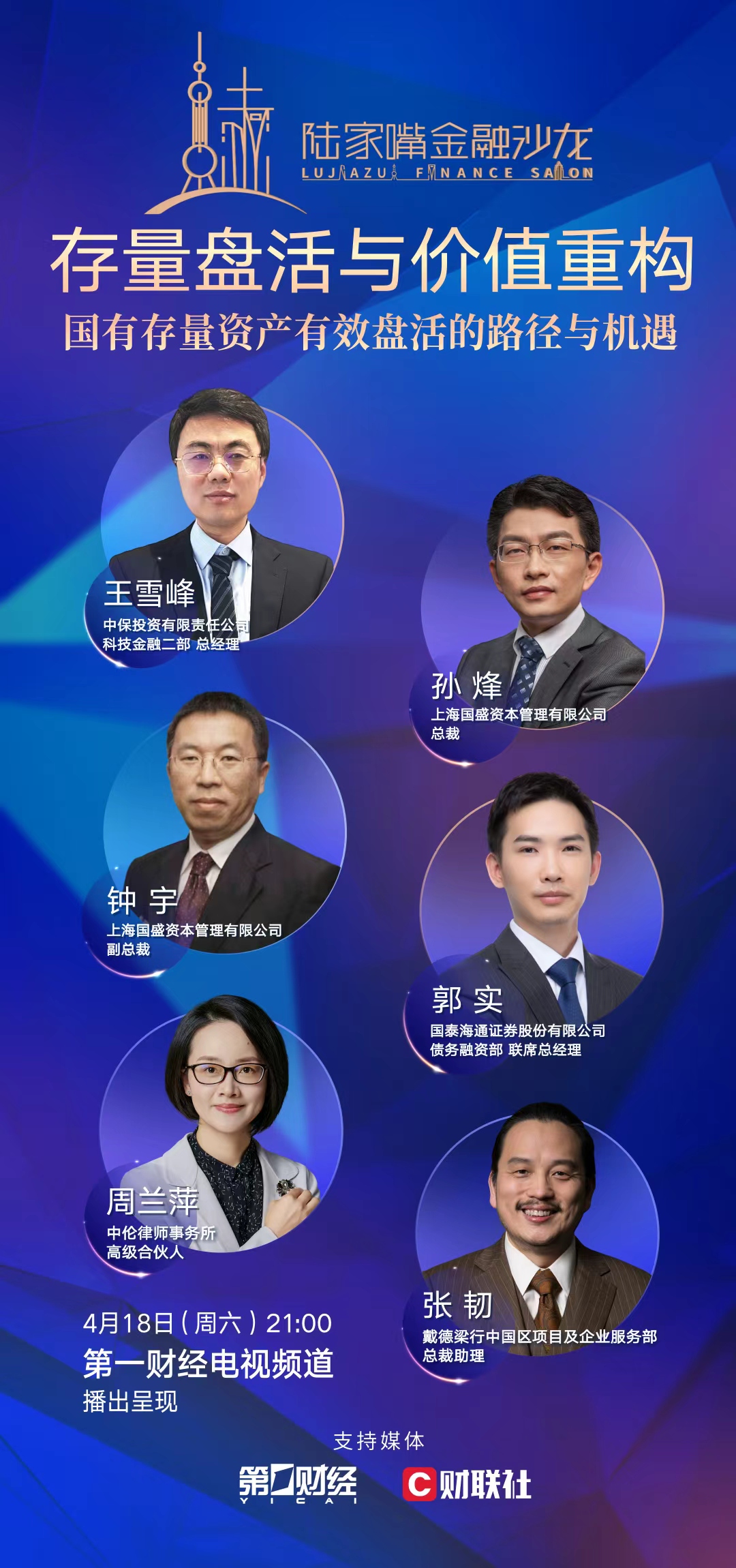本期陆家嘴金融沙龙,以“存量盘活与价值重构——国有存量资产有效盘活的路径与机遇”为主题,邀请多位重磅嘉宾展开深入探讨。该期沙龙的电视节目于2026年4月18日21点在第一财经频道播出。