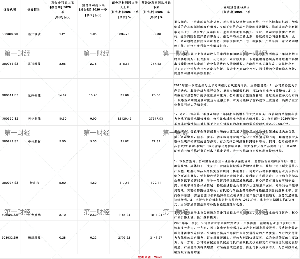 随着2026年一季报预告陆续披露,锂电板块交出了一份亮眼的成绩单。Wind数据显示,截至4月15日,已发布业绩预告的8家锂电上市公司中,6家企业净利润同比实现了翻倍式增长,其中天华新能以最高32120.45%的同比增幅“一骑绝尘”,嘉元科技、石大胜华、德新科技、震裕科技也实现数倍乃至数十倍的增长。