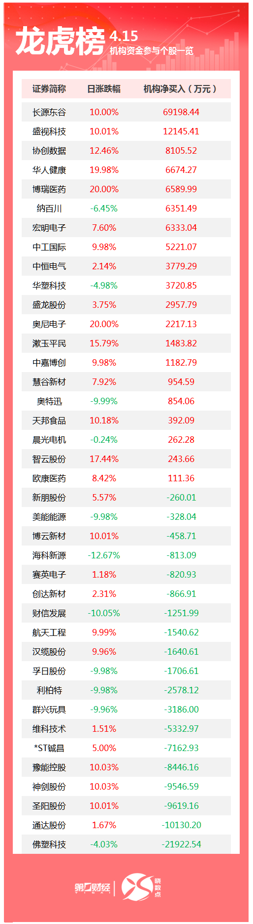 当天机构净买入前三的股票分别是长源东谷、盛视科技、协创数据,净买入金额分别是6.92亿元、1.21亿元、8106万元。