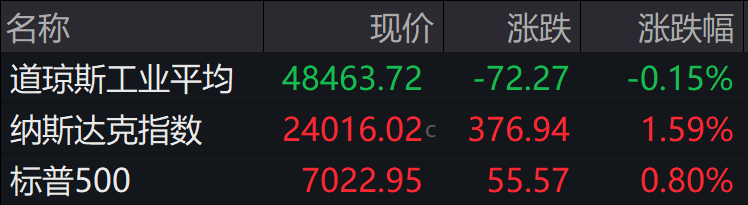 ►►当地时间周三,美股三大股指走势分化,标普500指数与纳指收于历史新高。截至收盘,道指跌0.15%,纳指涨1.59%,标普500指数涨0.80%。