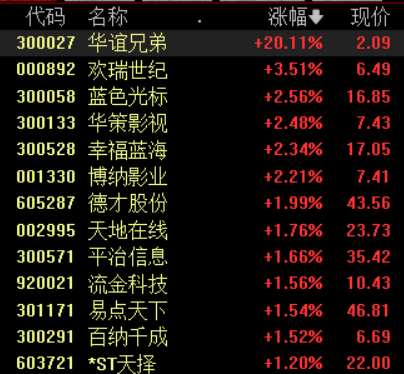 具体来看,短剧游戏板块高开,华谊兄弟20cm涨停,欢瑞世纪、蓝色光标、华策影视、幸福蓝海纷纷高开。