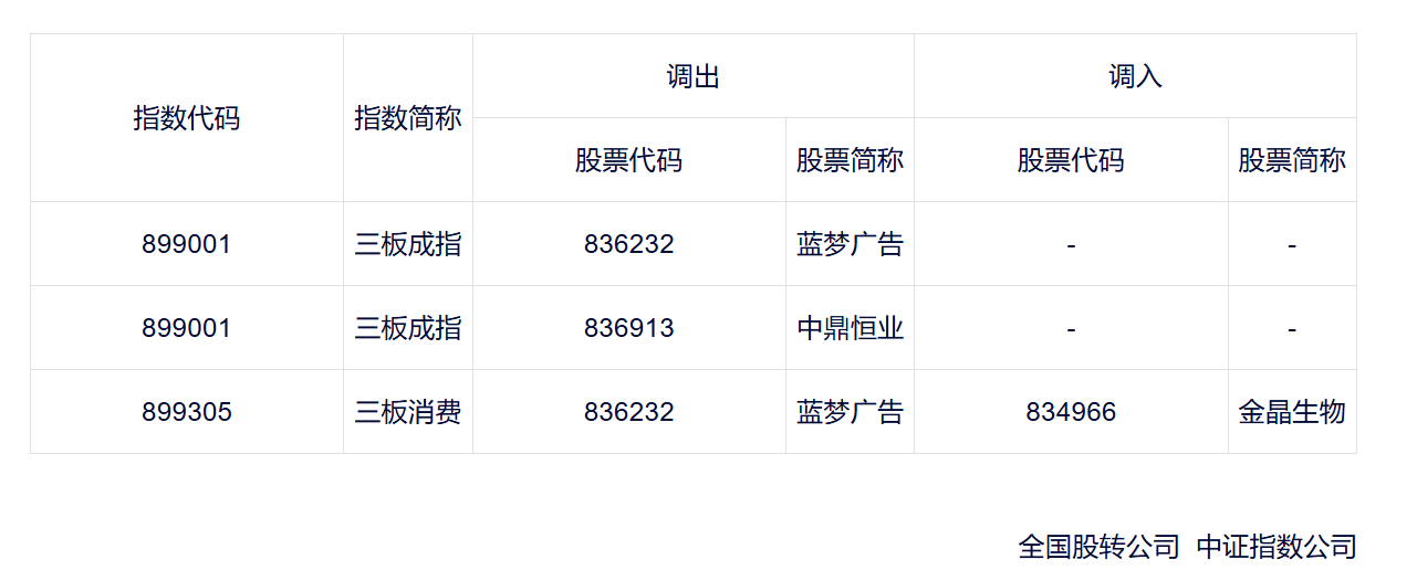 中证指数:调整三板指数样本股