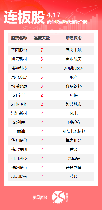 4月17日,Wind数据显示,A股市场共计77只个股涨停。其中固态电池板块圣阳股份收获7连板,机器人概念股盛视科技4连板。一图速览今日连板股>>