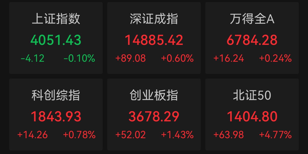 4月17日,A股四大股指今日收盘涨跌不一,创业板指涨1.43%,再创近11年新高;上证指数跌0.1%,深成指涨0.6%,科创综指涨0.78%;此外,北证50指数涨4.77%。