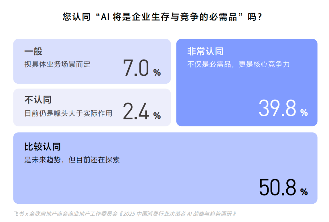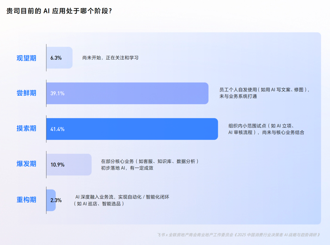 但现实是残酷的。飞书和全联房地产商会商业地产工作委员会发起的百家消费企业调研揭示了一个“扎心”的数据:虽然 91%的决策者认同AI是企业生存与竞争的必需品,但高达 80%的企业仍卡在“尝鲜”和“摸索”阶段,极缺深度业务融合。真正用好 AI 的企业少之又少。