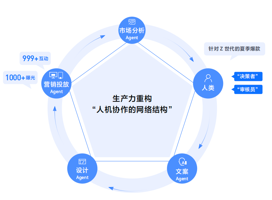 消费企业生产力正在被重构成“人机协作的网络结构”,人类员工是决策者和审核者,带领数字员工 Agent 成员共同实现组织目标。