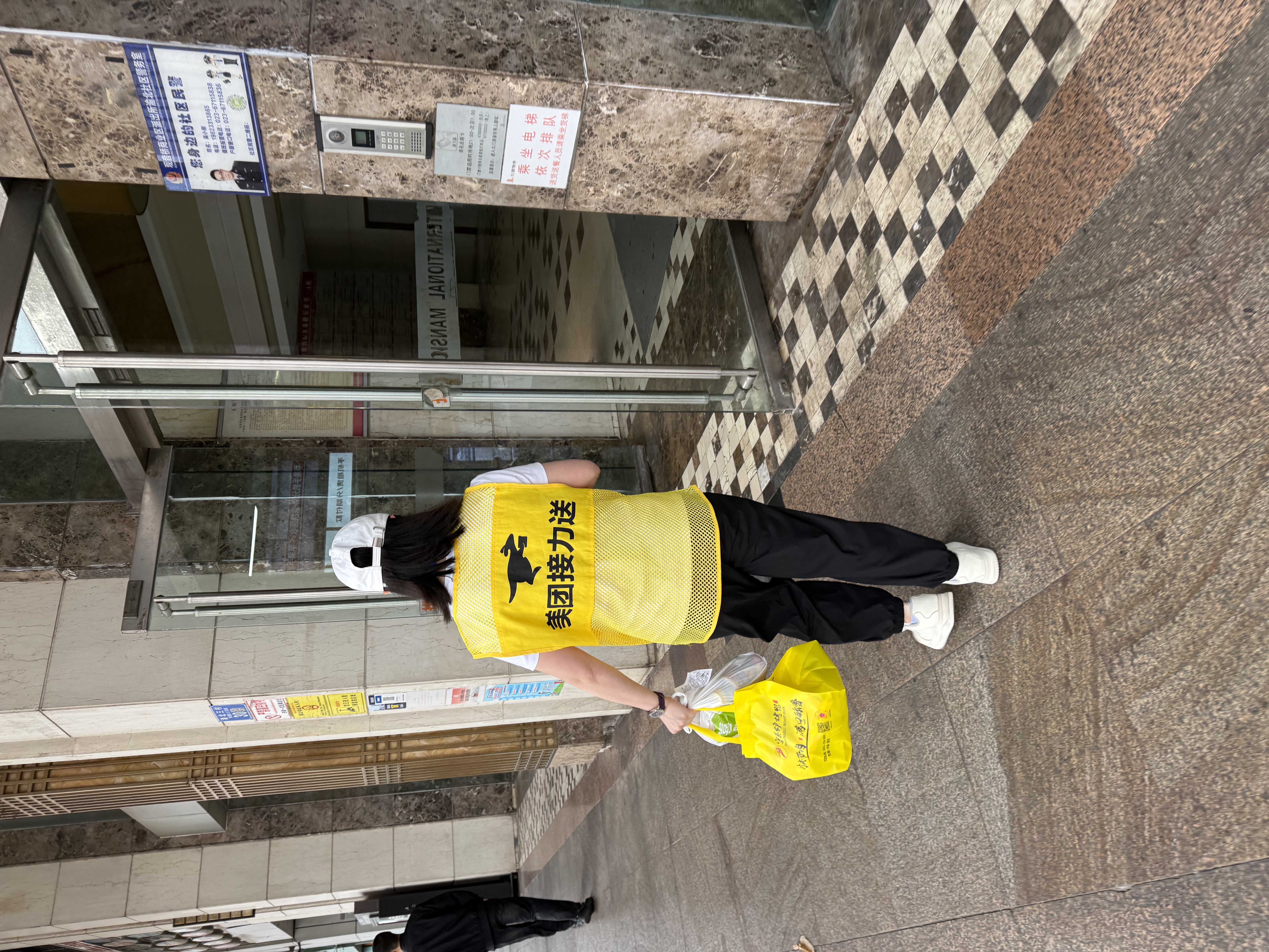 去年11月,杨雯看到美团在招聘接力员,报名并入职。她的上下班时间和大厦运营时间接近,每天上午10点半达到点位,等待订单,在大厦晚上8点结束营业时下班。