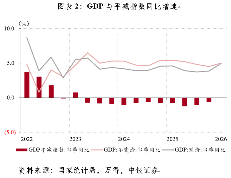 一季度,我国经济开局良好,实际GDP同比增速环比加快0.5个百分点。其中,受货物贸易顺差同比下降的影响,外需拉动经济增长0.8个百分点,环比回落0.6个百分点;消费拉动经济增长2.4个百分点,与上季基本持平;但随着“两重”建设加快推进,投资拉动经济增长1.9个百分点,环比上升1.2个百分点。同时,由于当季物价走势改善,GDP平减指数同比下降0.06%,跌幅大幅收敛,显示我国促进物价合理回升的再通胀努力曙光乍现。受此影响,名义GDP同比增长4.94%,与实际GDP增速基本持平(见图表2)。