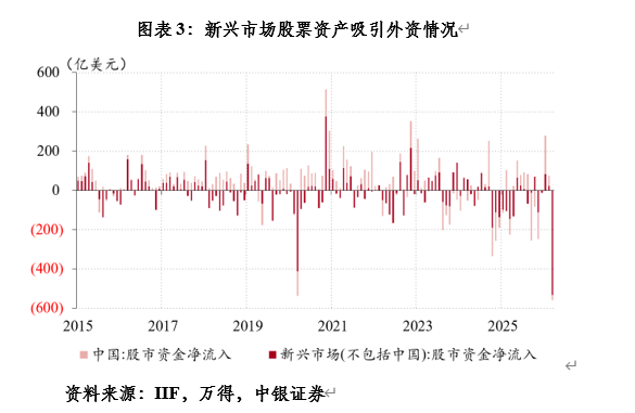 股票市场方面,新兴市场股票资产遭遇较大规模抛售。3月份,明晟(MSCI)全球指数累计下跌6.4%,MSCI新兴市场指数下跌10.7%,跌幅大于MSCI发达市场指数的5.9%。其中,韩国综合指数跌幅居前,累计下跌19.1%,而上证综指仅下跌6.5%,与MSCI全球指数跌幅大体相当,深圳创业板指数下跌3.8%,小于同期标普500指数5.1%的跌幅。国际金融协会(IIF)数据显示,3月份外国投资者从新兴市场资产中撤资703亿美元,创下2020年3月新冠疫情引发市场暴跌以来的最大单月资金流出,与此前两个月的资金流入趋势形成鲜明对比。其中,新兴市场股票(尤其是亚洲股票)资金流出560亿美元,为至少20年来最大撤资规模,是本次资金外流的主要来源;中国股票资金由上月净流入52亿美元转为净流出26亿美元,为时隔三个月后重新净流出(见图表3)。