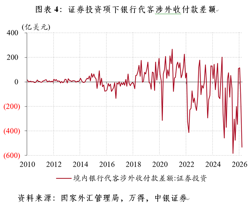 债券市场方面,主要经济体债券普遍承压。3月份,英国、德国、美国和日本10年期国债收益率累计分别上升57、34、33和24个基点。同期,中国10年期国债收益率在1.82%附近运行,较2月末仅小幅走高3个基点,整体维持低波动态势。由于同其他主要债券收益率的低相关性,人民币债券被部分市场机构誉为“避险资产”。然而,中债登、上清所数据显示,3月份,在全球市场恐慌情绪高涨的背景下,人民币债券市场并未吸引大规模外资流入。当月,境外机构境内人民币债券持有量连续11个月减少,且降幅重新过千亿元,从上月的303亿元扩大至1342亿元。其中,记账式国债是主要拖累项,境外机构持有量由上月的增加192亿元转为减少526亿元,降幅为2025年8月以来新高。同期,证券投资项下银行代客涉外收付款连续两个月出现逆差,且规模从上月的110亿美元扩大至532亿美元,创历史次高(见图表4)。