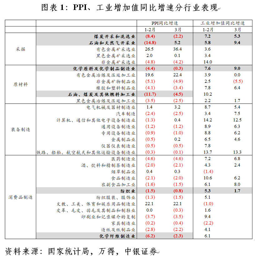 一季度,PPI同比下降0.6%,降幅较上年四季度收窄1.5个百分点。其中,3月份PPI同比上涨0.5%,结束了连续41个月同比下降的态势;环比上涨1.0%,连续6个月上涨。按大类分,3月份PPI同比增速转正主要反映了生产资料价格上涨的影响:生产资料价格同比增速由上月-0.7%转为1.0%,对PPI增速的拉动作用由上月-0.6个百分点转为0.8个百分点,而生活资料价格继续下跌,但同比跌幅由上月1.6%收窄至1.3%,其对PPI同比增速的拖累作用较上月收窄0.1个百分点。