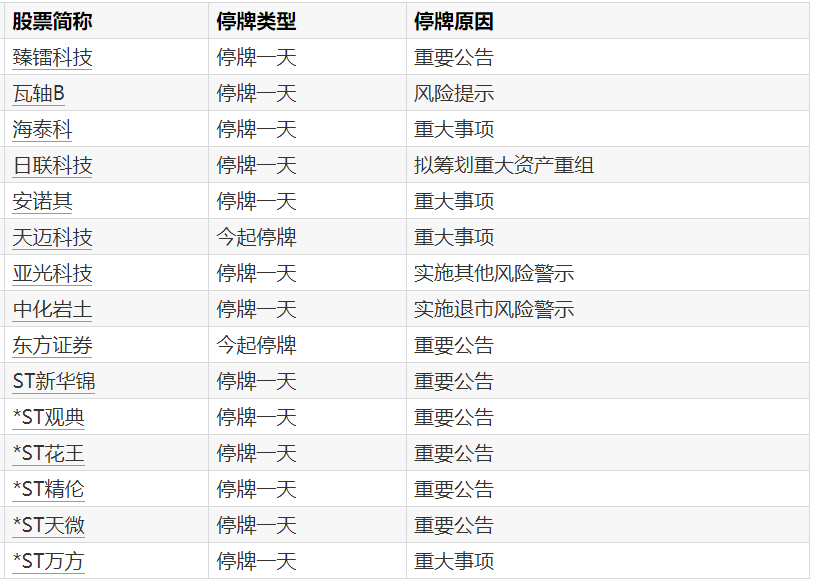 A股停牌提示:12股今日停牌