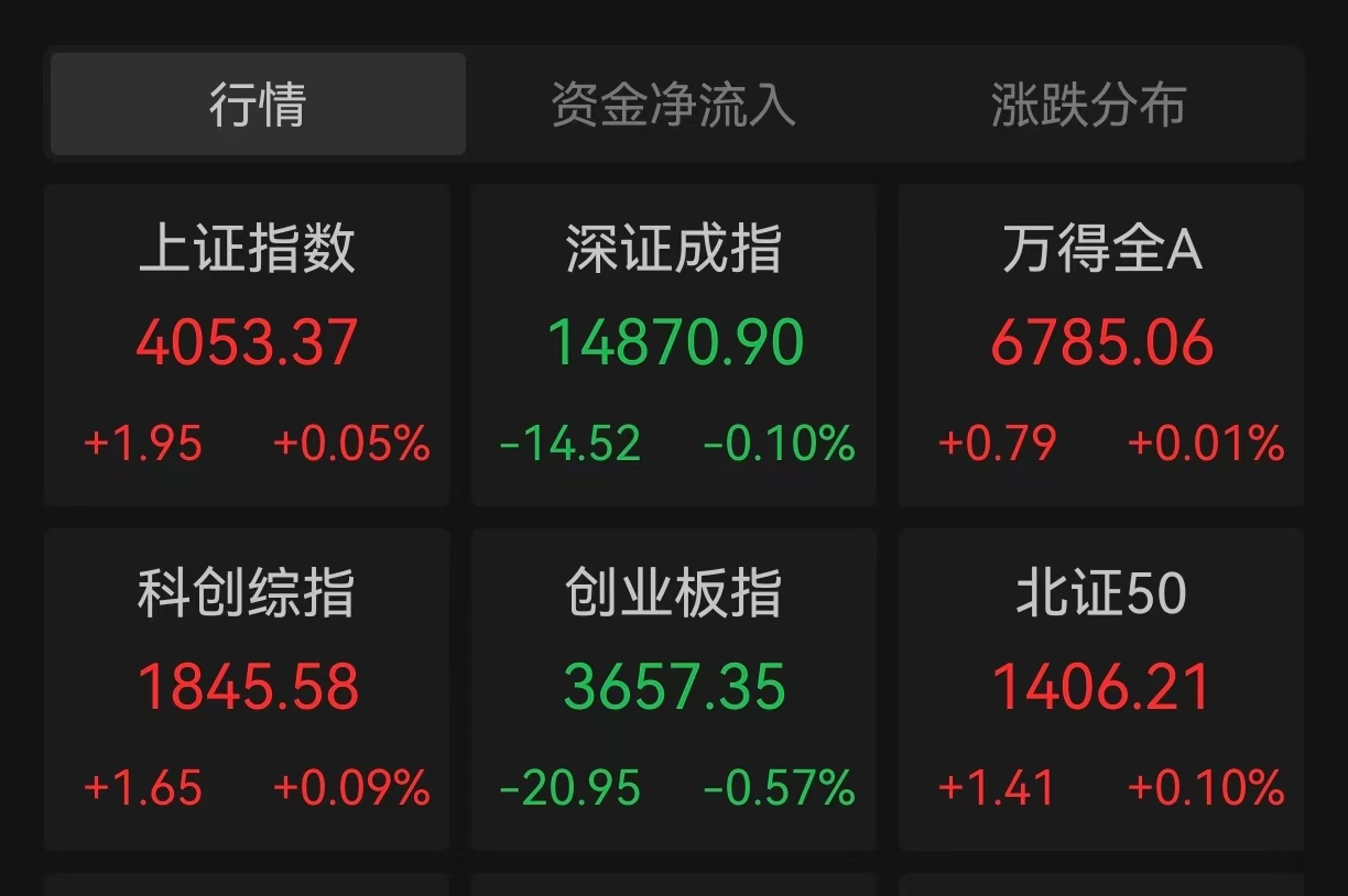 4月20日,四大股指开盘涨跌不一,上证指数开盘报4053.37点,涨0.05%,深成指开盘报14870.9点,跌0.1%,创业板指开盘报3657.35点,跌0.57%,科创综指开盘报1845.58点,涨0.09%。