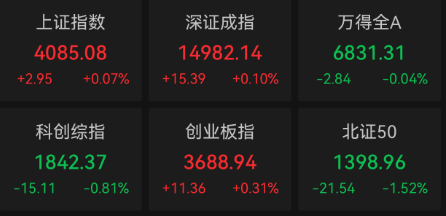 4月21日,四大股指收盘涨跌不一,沪指报收4085.08点,涨0.07%,深成指报收14982.14点,涨0.1%,创业板指报收3688.94点,涨0.31%,科创综指报收1842.37点,跌0.81%。
