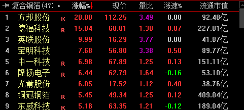 具体来看,铜箔概念股走强,方邦股份、英联股份涨停,中一科技、铜冠铜箔等多股涨超5%。