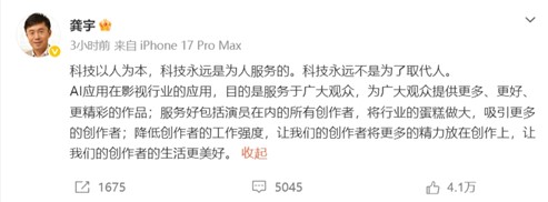 4月21日凌晨,原发媒体发布更正信息,表示:原文提及的于和伟、张若昀等艺人未入驻爱奇艺AI艺人库。当天,龚宇也通过社交账号再次重申了AI应用于影视行业的目的:服务于广大观众,提供更多、更好、更精彩的作品;服务好包括演员在内的所有创作者,将行业的蛋糕做大;降低创作者的工作强度,让创作者将更多精力放在创作上。