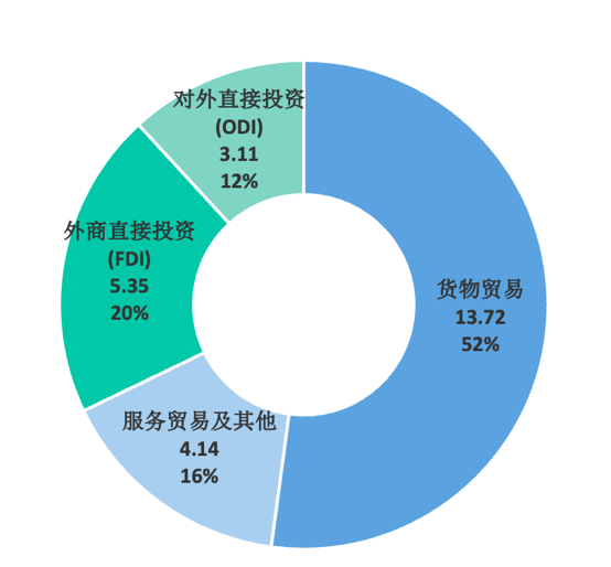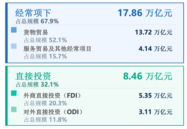 从人民币跨境结算金额的结构来看,通常包括经常项下和直接投资两大类。目前,经常项下结算占比达到了总规模的67.9%,金额为17.86万亿元(见下图)。货物贸易仍在经常项下占主导地位,占比达52.1%,金额为13.72万亿元;与此同时,服务贸易及其他经常项目的占比正呈现出稳步上升的态势,目前已占总规模的15.7%,金额为4.14万亿元。