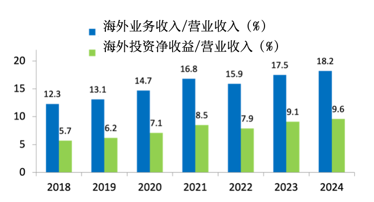 从企业微观层面看,中国企业国际化经营的市场广度和运营深度都在持续加强。数据显示,A股上市公司海外业务收入在营业收入中的占比均值,已从2018年的12.3%稳步攀升至2024年的18.2%(见下图)。同时,海外投资净收益与营业收入之比的均值也从5.7%上升至9.6%。