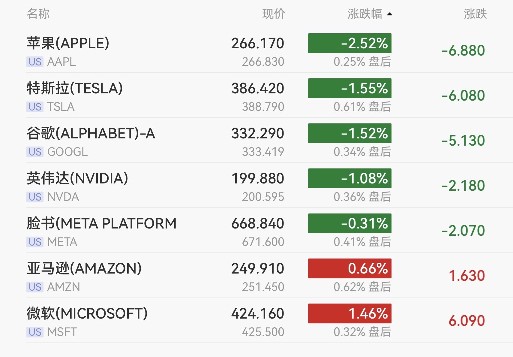 奈飞跌2.37%,特斯拉跌1.55%,谷歌跌1.52%,英伟达跌1.08%,Meta跌0.31%,微软涨1.46%。