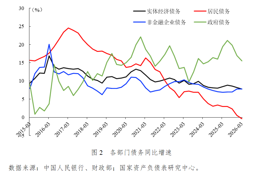 居民和企业部门债务增速低迷,政府部门债务积极扩张。2026年一季度实体经济债务同比增长7.8%,创2001年以来新低。其中,居民部门债务同比增长-0.4%,自1995年三季度以来首次出现负增长,显示居民部门信用收缩加剧。企业部门债务同比增长7.8%,与去年末增速持平,仍处于历史低位。政府部门债务同比增长15.5%,在去年同期高基数上保持较快增长,体现了积极的财政政策靠前发力。