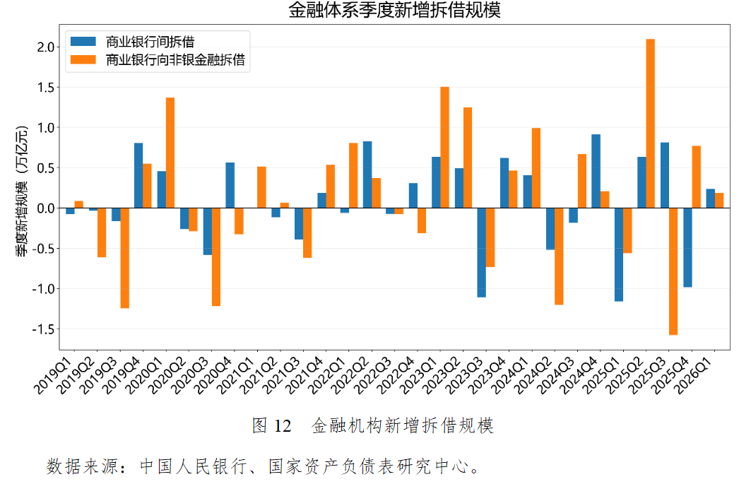 2025年三季度商业银行向非银金融拆借跌至-1.58万亿元,这与国债增值税免税政策的取消直接相关。公募基金等非银机构的预期收益率下降,被迫在二级市场抛售债券,并偿还来自于商业银行的杠杆资金。被抛售的债券最终回流到商业银行资产负债表中,导致商业银行向外部拆借资金的下降。经历了2025年下半年的监管规范调整及资产负债表调整后,金融体系的交易结构被彻底重塑。2026年一季度,商业银行间拆借新增8200亿元,而向非银拆借新增仅为1800亿元。