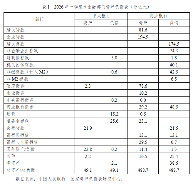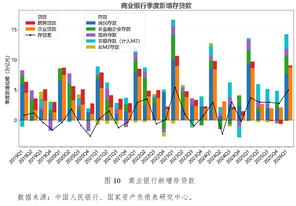 2026年一季度末,中央银行总资产为49.1万亿元,商业银行总资产高达488.7万亿元,两者的资产规模比约为1:10。中央银行的资产端主要为国外资产和央行贷款,负债端的核心是准备金存款和通货,两者构成了宏观经济的基础货币主体。商业银行资产端的企业贷款和居民贷款合计占总资产的56.6%,是实体经济融资绝对主力。同时,商业银行持有政府债券高达78.6万亿元,反映出商业银行在配合积极财政政策、承接国债和地方债发行方面发挥了压舱石作用。商业银行负债端的主要资金来源是居民存款和非金融企业存款,体现了典型的间接融资体系特征。
