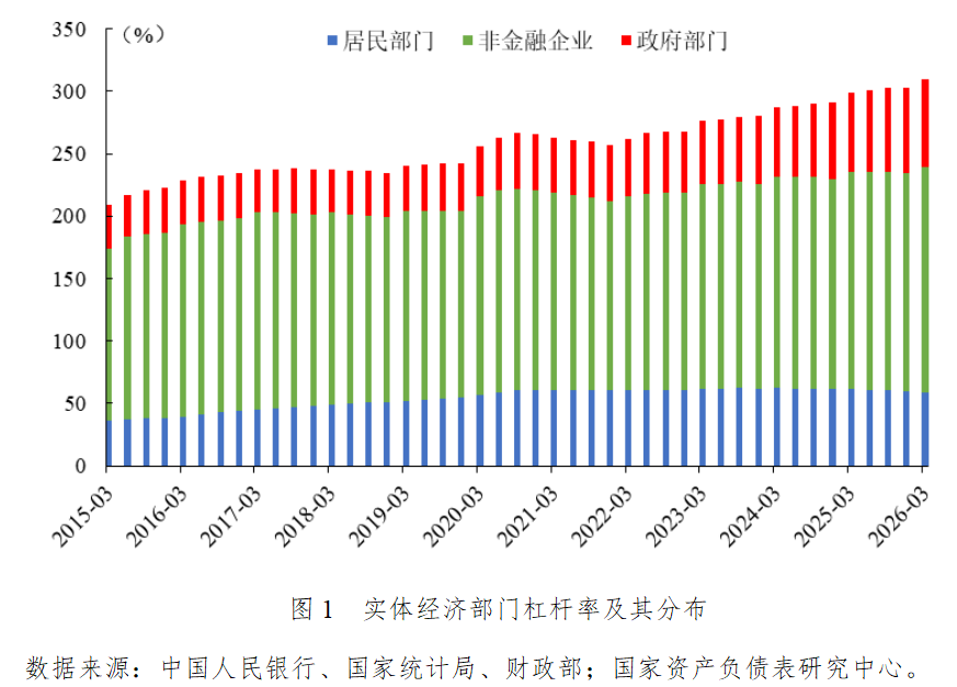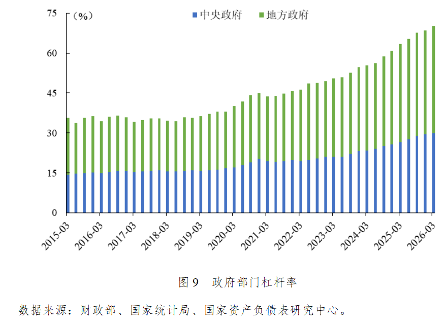 2026年一季度政府部门杠杆率上升1.8个百分点,从2025年末的68.5%上升至70.3%。其中,中央政府杠杆率上升0.5个百分点,从2025年末的29.4%上升至29.9%;地方政府杠杆率上升1.3个百分点,从2025年末的39.1%上升至40.4%。
