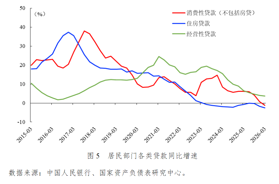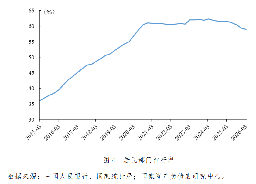 2026年一季度居民部门杠杆率下降0.4个百分点,从2025年末的59.4%下降至59.0%,自2024年二季度起持续去杠杆。随着房价下跌引发的负资产效应凸显,消费信贷收缩对居民部门去杠杆的拖累作用加重。
