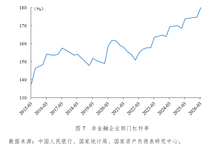 2026年一季度非金融企业杠杆率上升5.3个百分点,从2025年末的174.7%上升至180%。企业部门杠杆率结构性分化体现在两方面:一是社融结构中直接融资占比提升,债券融资替代银行贷款成为信用扩张的主要动力;二是输入性通胀对不同行业价格和利润造成结构性冲击,企业部门加杠杆意愿出现分化。
