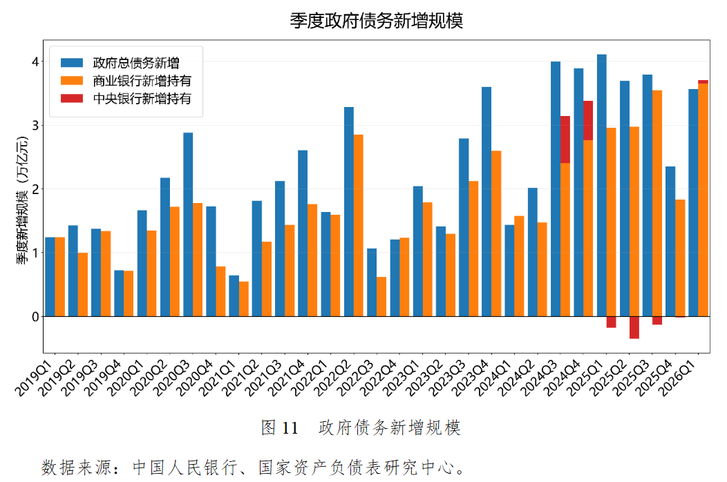 2026年一季度,政府总债务新增高达3.56万亿元,中央银行新增持有政府债券为552亿元。自2024年三季度起,央行开始常态化、小额度地增持政府债券,这标志着中国基础货币投放机制的彻底重构。央行在二级市场大规模买卖国债,可以部分替代过去的MLF和外汇占款,成为流动性投放工具。商业银行新增持有政府债券3.65万亿元,这意味着商业银行不仅在一级市场上全部包揽了财政部新发行的3.56万亿元全部国债和地方债,而且还在二级市场上净买入存量旧债。