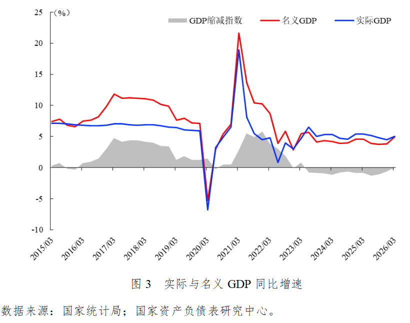 2026年一季度,国内物价数据呈现积极变化,主因是美以伊冲突带来的输入性通胀,内生需求的拉动作用依然有限。物价企稳带动名义经济增长回升,GDP缩减指数接近转正,有望扭转自2023年二季度起连续11个季度为负的局面,从而缓解宏观杠杆率被动上升压力。但从长远看,保持宏观杠杆率基本稳定较大程度上依赖于通胀预期改善和名义增长回升的持续性。