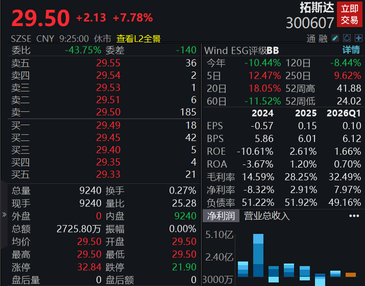 个股方面,拓斯达高开超7%,公司一季度净利润4808.33万元,同比增长1147.36%。