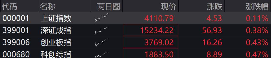 A股四大指数集体高开,沪指高开0.11%,深成指高开0.38%,创业板指高开0.43%,科创综指高开0.47%。
