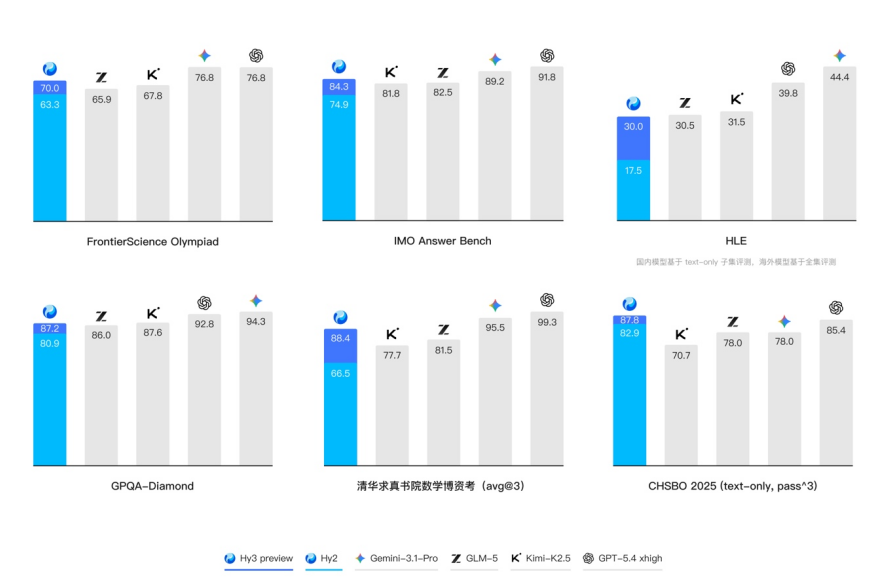 从定位看,Hy3 preview主推Agent能力、上下文学习能力、复杂推理能力和代码能力。从基准测试得分看,该模型的能力仍与Gemini-3.1-Pro、GPT-5.4 xhigh有差距,但在部分基准测试中得分接近或高于国内的大模型Kimi-K2.5和GLM-5。