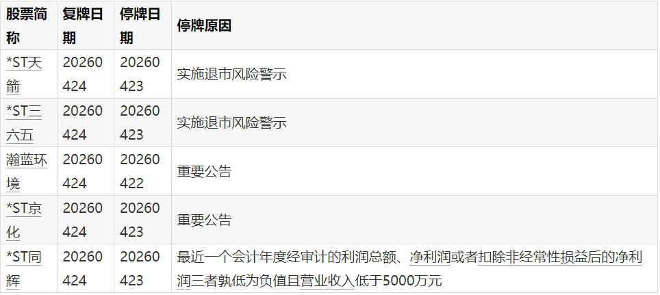 Wind数据显示,4月24日,*ST天箭、*ST三六五、瀚蓝环境等5只个股复牌。