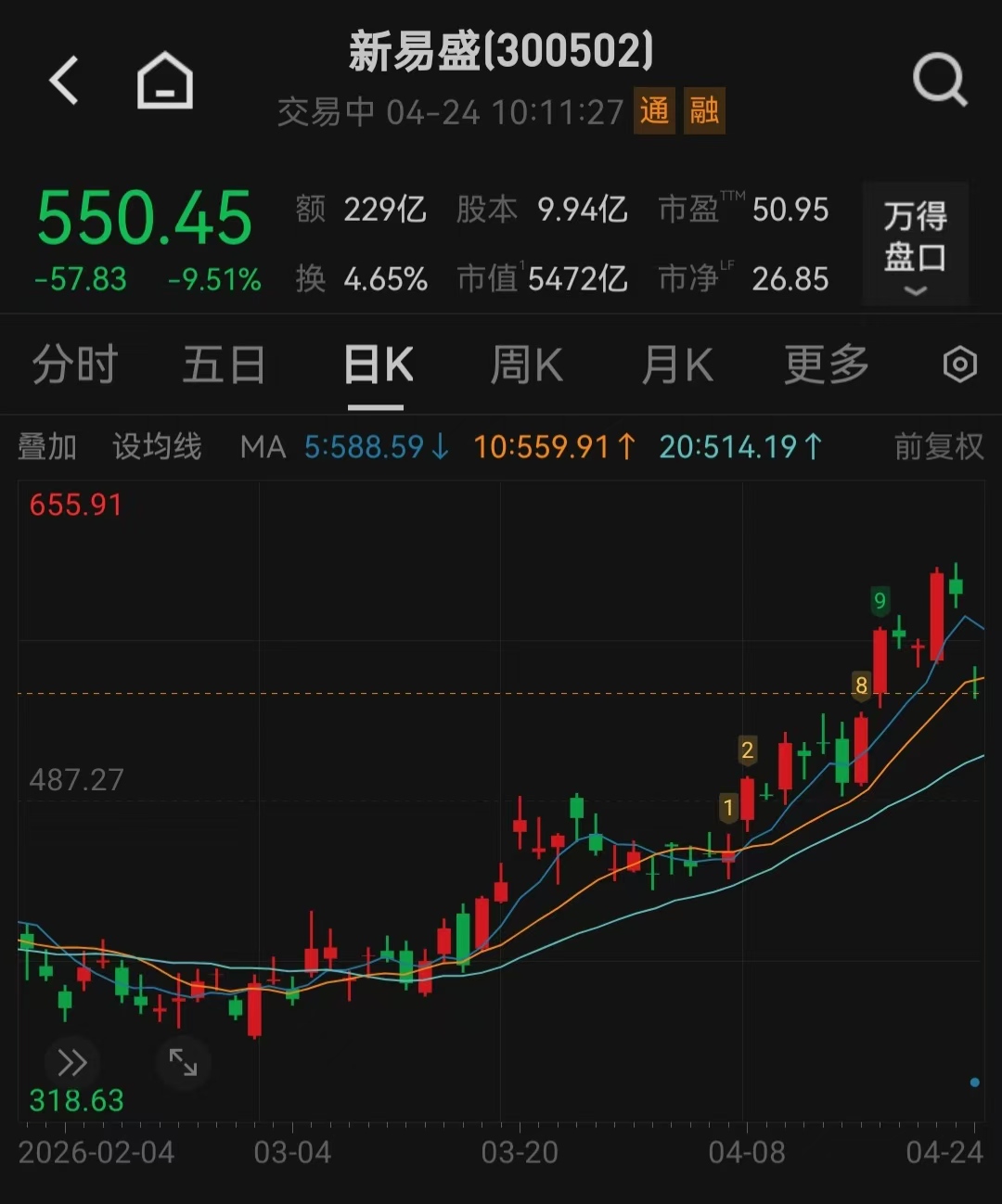 4月24日开盘,新易盛(300502.SZ)股价跌超9%,盘中市值跌破5500亿元。而4月22日收盘,新易盛股价刚创历史新高,市值站上6000亿元。