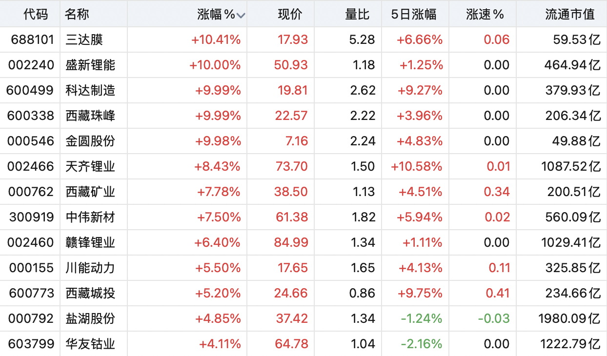 具体来看,盐湖提锂板块全天强势,盛新锂能、科达制造、西藏珠峰、金圆股份涨停。