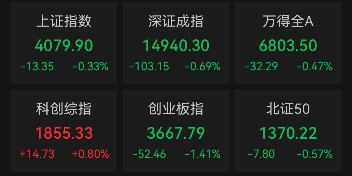 4月24日,四大股指收盘涨跌不一,上证指数报收4079.9点,跌0.33%;深成指报收14940.3点,跌0.69%;创业板指报收3667.79点,跌1.41%;科创综指报收1855.33点,涨0.8%。