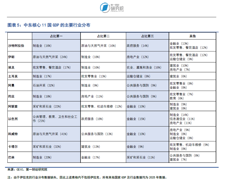 我们在图表5中罗列了当前中东核心11国的GDP行业分布,可以更加细致地观察到区域内部各个国家的优势产业和结构分化。这些国家并未形成单一发展模式,而是围绕资源禀赋、人口规模与制度环境,呈现出不同的经济发展模式。