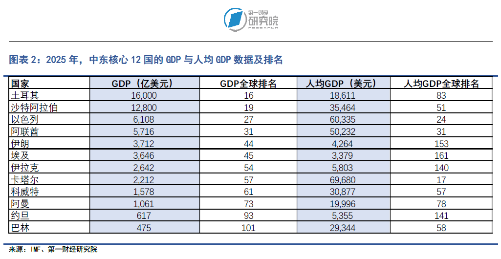 从国际货币基金组织(IMF)测算的GDP数据来看,2025年土耳其和沙特阿拉伯的名义GDP分别为1.6万亿美元和1.28万亿美元,是12国中GDP超过1万亿美元的两个国家,在全球的排名分别为第16和19。以色列、阿联酋、伊朗和埃及的GDP分别为6108亿美元、5716亿美元、3712亿美元和3646亿美元,这四个国家的GDP全球排名均在前50位以内。约旦和巴林的GDP总量在12国中垫底,分别为617亿美元和475亿美元。