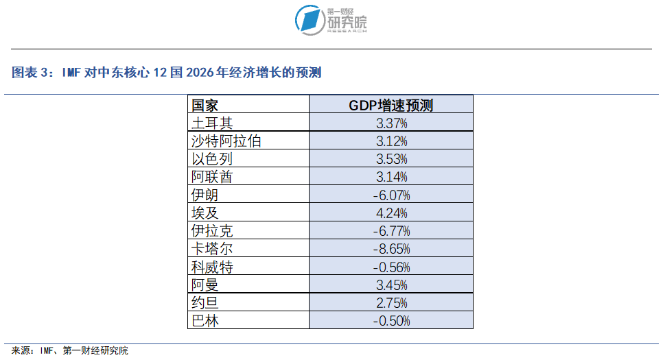 从GDP增速来看,2026年中东核心12个国家的经济表现将呈现分化走势。IMF在今年4月发布的《世界经济展望》中指出,美以伊冲突使全球经济增长戛然而止,如果冲突持续,霍尔木兹海峡被关闭以及能源关键设施遭到严重破坏,有可能会引发一场重大能源危机,全球经济将受到更深远、更持久的冲击。其中,海湾能源出口国将面临基础设施受损、生产扰动、出口受限以及旅游业和商业活动疲软带来的经济冲击。由于袭击和预防性停产,伊拉克、科威特、沙特阿拉伯和阿联酋的能源生产大幅下降,卡塔尔的液化天然气设施也遭到严重破坏。