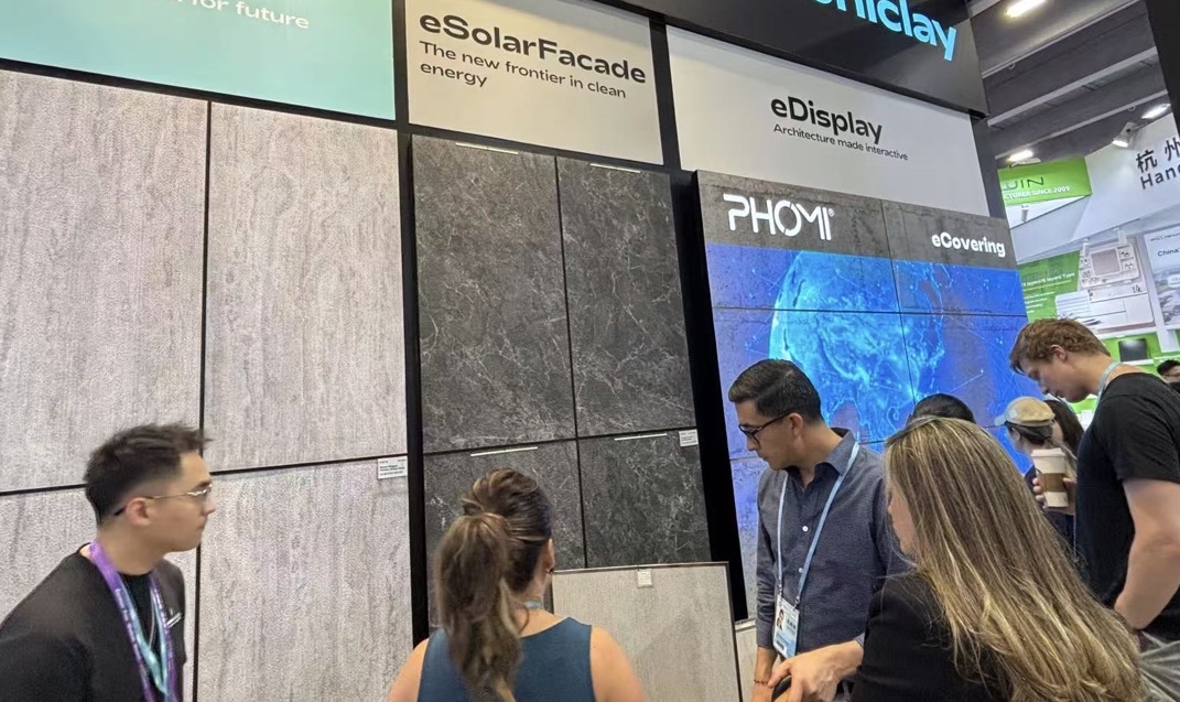 还有企业将新型建材与光伏、LED显示等结合,受到海外客商欢迎。广西福美新材料有限公司国际营销部高级总监冯良成对记者说,他们利用建筑固体废物,结合改性技术,可以做出多种新型环保建材,包括可灵活造型的软瓷、带光伏或显示的外墙建材。他们的光伏云石幕已经出口到意大利、日本、韩国和美国等地,这些幕墙里植入了光伏板,客户只需加上逆变器、储能系统,就可以利用外墙来进行光伏发电。