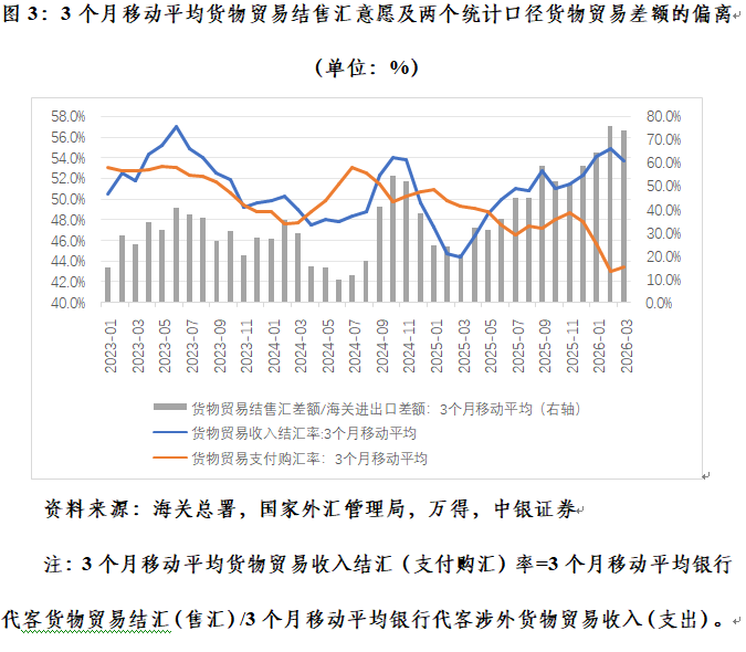 从外汇供求关系看,2025年3月至2026年3月,银行结售汇连续13个月顺差,累计顺差5974亿美元,其中银行代客货物贸易结售汇累计顺差6867亿美元,相当于同期海关进出口顺差的53.6%,贡献了银行结售汇顺差的115.0%。如果贸易顺差下降,将影响货物贸易结售汇顺差对冲资本外流压力的能力。