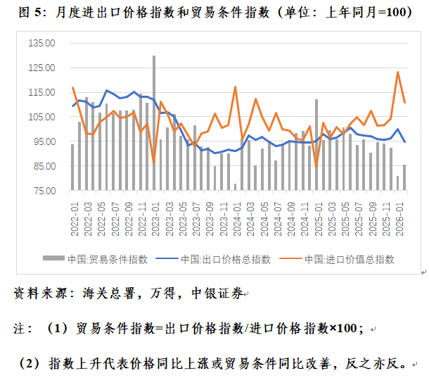 最后,贸易条件恶化收敛顺差。中东战争导致能源价格飙升,加大输入性通胀压力,推动3月份中国工业生产者出厂价格指数(PPI)同比由负转正,一季度消费者价格指数(CPI)、核心CPI和国内生产总值(GDP)平减指数同比变动也趋于改善。但是,中东局势动荡将恶化全球经济和贸易增长前景,加剧中国供强需弱的矛盾。在内贸领域或表现为抑制PPI通胀向CPI的传导,在外贸领域则表现为出口价格指数上涨不及进口价格指数。后者将导致中国贸易条件进一步恶化,意味着中国要用更多的出口置换等量的进口,同时也意味着贸易顺差进一步下降。2026年1、2月份,中国贸易条件指数分别为81.10和85.57,处于近年来的低位(见图5)。一季度,中国进口增速加快,贸易顺差下降,就与成品油、铜矿砂等国际大宗商品价格明显上涨,且涨价效应向下游传导,塑料橡胶、集成电路等产品进口成本上升有关。